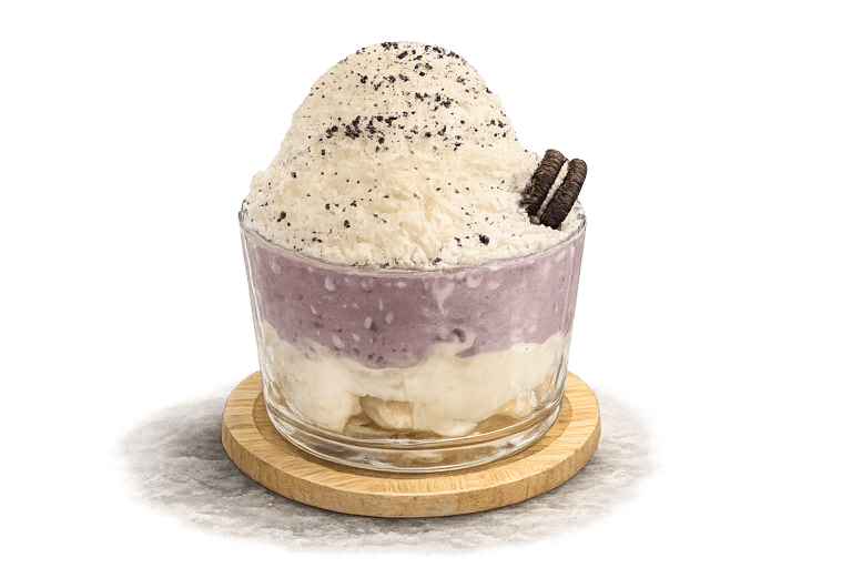 mochi et purée de taro, avec glace pilée au lait et morceaux d’Oreo