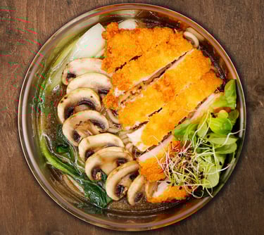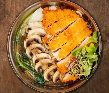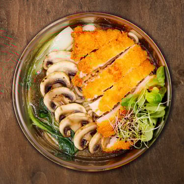 C'est un plat savoureux alliant fraîcheur et croustillant. Le poulet pané, tendre et juteux, accompagne des nouilles dans un bouillon clair aux champignons. Ce bouillon est préparé à partir d’un mélange de champignons soigneusement mijotés, offrant un arôme riche et des saveurs complexes. (avec bouillon)