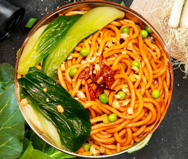 A classic Chinese dish, enjoyed for its creamy and fragrant sesame sauce. The noodles are first cooked and then cooled, before being mixed with a special sauce made from sesame paste, soy sauce, and garlic. Topped with sliced cucumbers, black mushrooms, carrots, and bean sprouts, they offer a refreshing texture and a savory taste—perfect for summer or a quick meal. (without broth) 13,5€