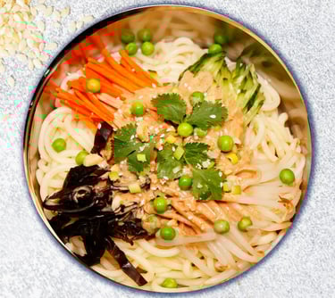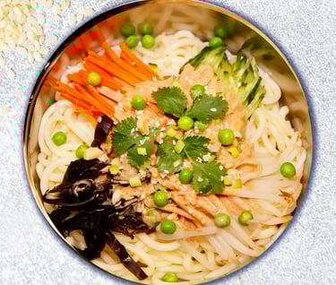 Un plat classique de la cuisine chinoise, apprécié pour sa sauce au sésame onctueuse et parfumée. Les nouilles sont d'abord cuites puis refroidies, ensuite mélangées avec une sauce spéciale à base de pâte de sésame, de sauce soja et d’ail. Garnies de concombres, champignons noirs, carotte émincés et de pousses de soja. Elles offrent une texture rafraîchissante et un goût savoureux, parfaites pour l'été ou un repas rapide. (sans bouillon)