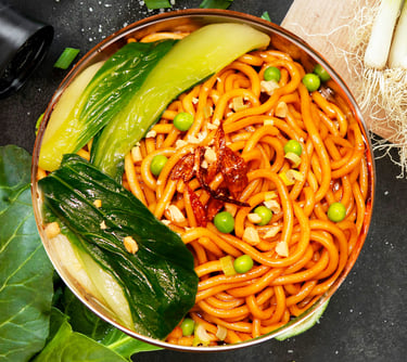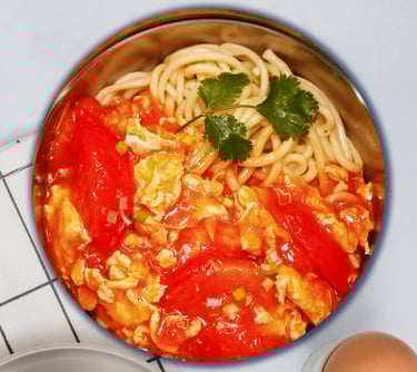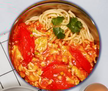 This refreshing and balanced dish combines the sweet and tangy flavor of sautéed fresh tomatoes with tender, golden scrambled eggs. Mixed with cooked noodles, the flavors blend perfectly without the need for broth. Light, flavorful, and suitable for all seasons, it is enjoyed by people of all ages. (without broth) 13,5€