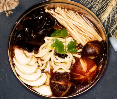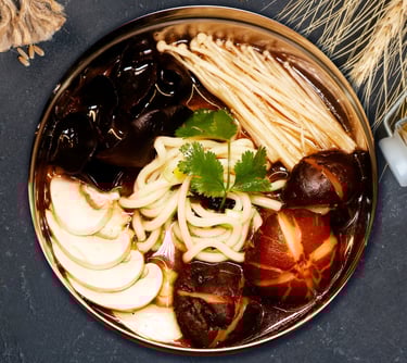 A light and flavorful dish, prepared with a clear and aromatic broth accompanied by tender noodles and a mix of four types of mushrooms. It is a healthy vegetarian recipe rich in umami ("savory taste") and comforting. (with broth) 14,5€