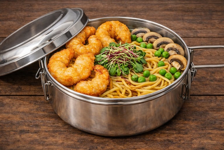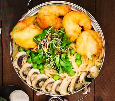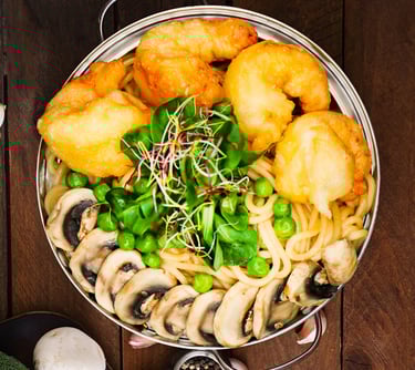 Savory noodles coated in a rich blend of butter and shrimp oil, accompanied by golden mushrooms and fried shrimp—a delicious and flavorful dish. (without broth) 17,5€