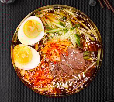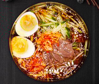 Prepared with thin buckwheat noodles, they are served cold in a refreshing broth, mixed with a spicy sauce, and topped with slices of beef, egg, and vegetables. They offer a fresh, tangy, and mildly spicy flavor.